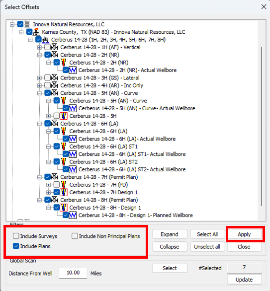 15\. In the Select Offsets window, select all relevant offset wells. If you need to select offset well plans, you will need to make them visible by activation them in the **Filters** section. Once you have selected the desired offsets, click on **Apply** and then **Close.**