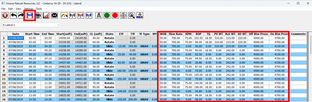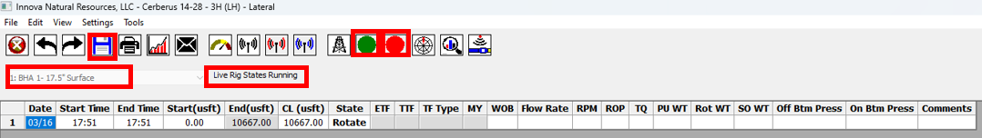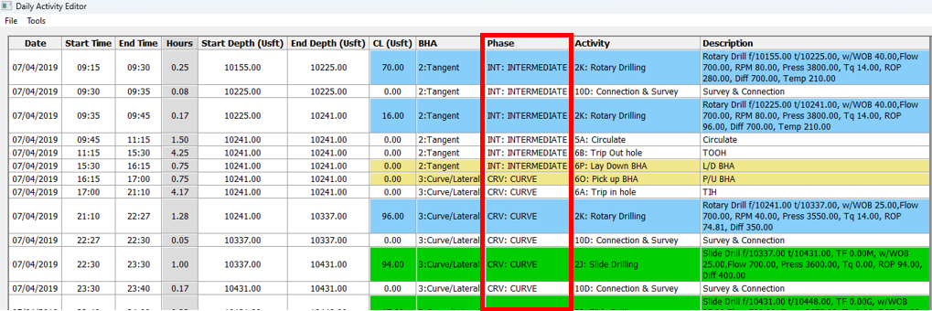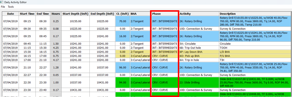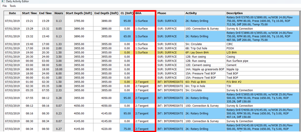 **c. BHAs** – Every BHA should have exactly one **6O: Pick Up** and one **6P: Lay Down** activity. Every row should have the BHA selected while it is in the hole. When no BHA is in the hole, the BHA cell should be blank.
