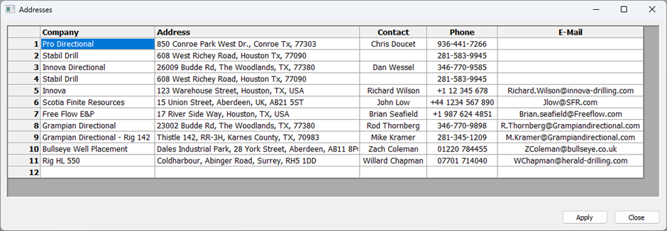 23\. In the Addresses window, list contains any relevant addresses for the upcoming job. For example, the address of the rig and the workshop that tools will be shipped to/from. This will aid the field personnel when they come to create shipping tickets. Once you are satisfied, click on the **Apply** button and then **Close**.