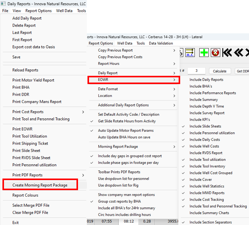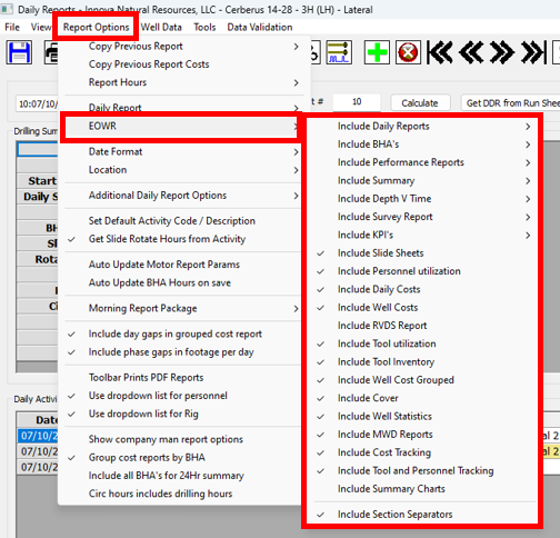 19\. You can now print your End of Well Report. In the Daily Reports window, open the **Report Options** menu and open the **EOWR** sub-menu. Toggle the options there on or off to set whether or not they are included in the EOWR.