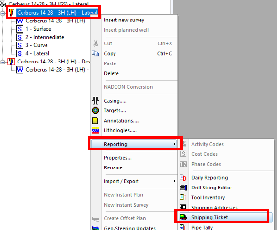 5\. Right click on the actual well and select **Reporting >> Shipping Ticket.**