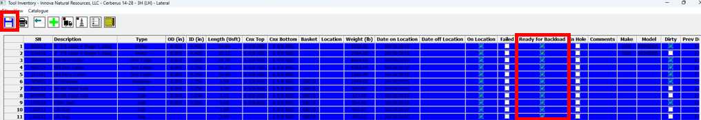 4\. Once you have finished prepping your tools for backload, right click on the actual well and select **Reporting >> Tool Inventory.** In the Tool Inventory, mark tools that are ready for backload by clicking in the **Ready for Backload** column. When you are finished, click **Save** and close the window.