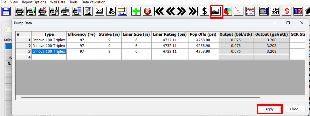 27\. Click on the **Cost Codes** icon on the toolbar. In the Cost Codes window, verify the cost codes are correct. Any changes to the codes here will only apply to the current well and do not affect the default codes. You can reset to the default codes by clicking on the blue arrow icon in the toolbar. Once you are satisfied, click on **Apply** and **Close.**