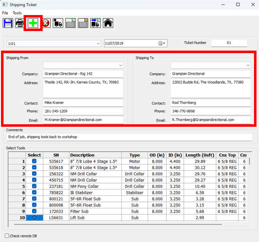 8\. **Save** your shipping ticket and then **Print** it. Once your tools have been shipped, you can click on the **Ship Tools** button to automatically mark your tools as off location in the Tool Inventory.