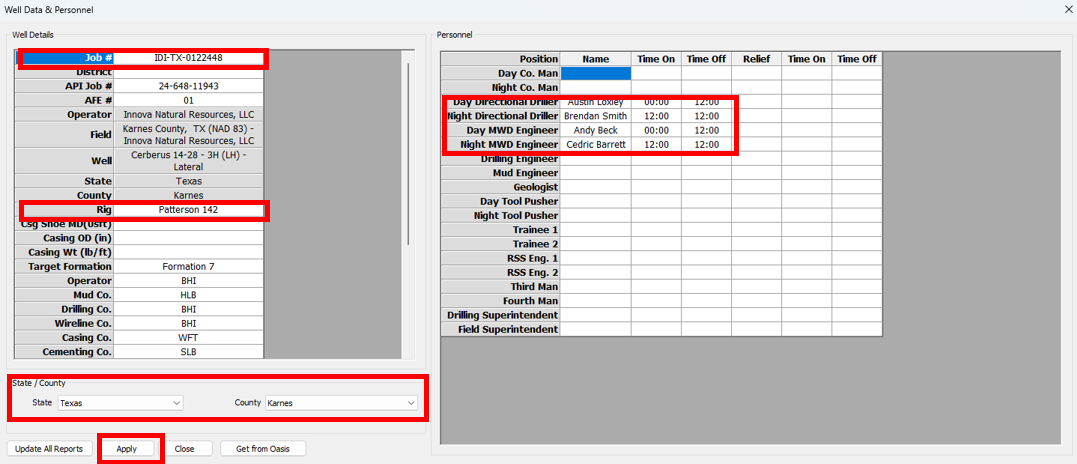 19\. In the Personnel Details window, ensure that the DD Coordinator, MWD Coordinator, DDs and MWD Engineers for the upcoming job are present in the list. Other personnel are optional. Once you are satisfied, click on the **Apply** button and then **Close**.