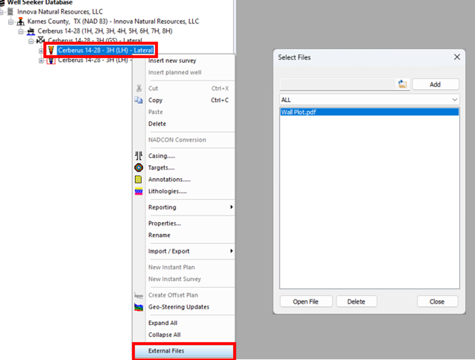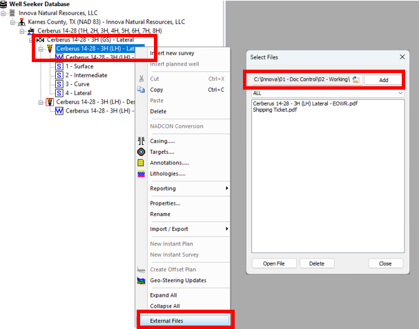 22\. Right click on the actual well in the database tree and select **External Files**. Add any relevant documents, such as the EOWR and the shipping ticket.