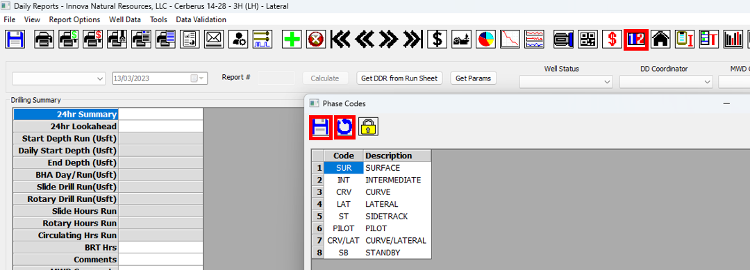 26\. Click on the **Phase Codes** icon on the toolbar. In the Phase Codes window, verify the phases codes are correct. Any changes to the codes here will only apply to the current operator and do not affect the default codes. You can reset to the default codes by clicking on the blue arrow icon in the toolbar. Once you are satisfied, click on the **Save** icon and close the window.