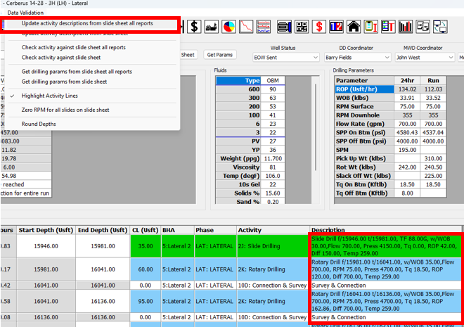 7\. Go back to the Daily Reports window, open the **Data Validation** menu and select **Update Activity Description from slide sheet all reports**. This will take the drilling parameters that you have just checked in your slide sheets, and use them to update the descriptions for your drilling and sliding activities in your Daily Report.