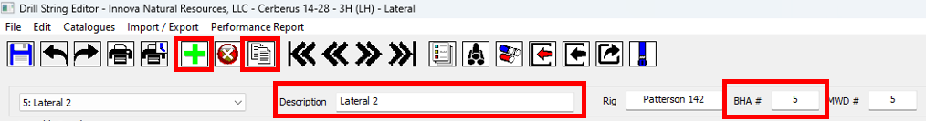 17\. In the Drill String Editor window click on the **Add New BHA** icon in the toolbar. In the newly crated BHA, input the BHA description and BHA number. Click on the **Save** icon and then close the window.