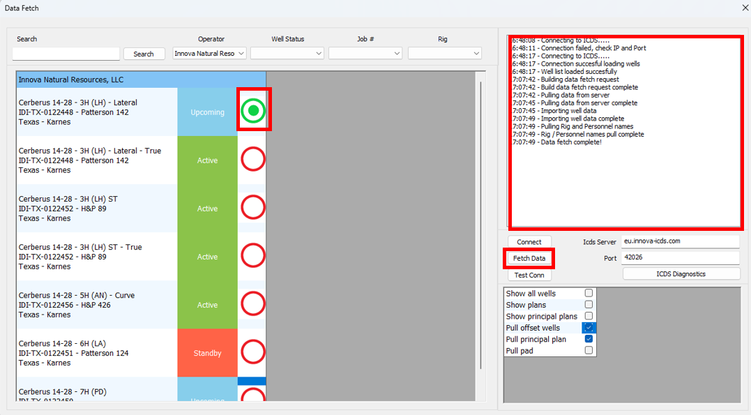 If you do not see any circles to select your well in the list, [**refer to this technical note**.](https://docs.innova-drilling.com/introduction/technical-notes/low-priority/remote-data-fetch-icons-missing)