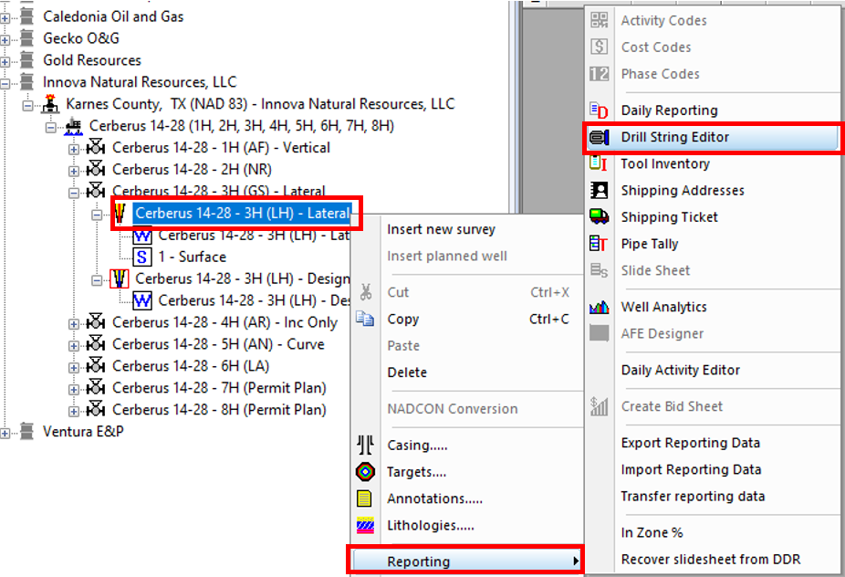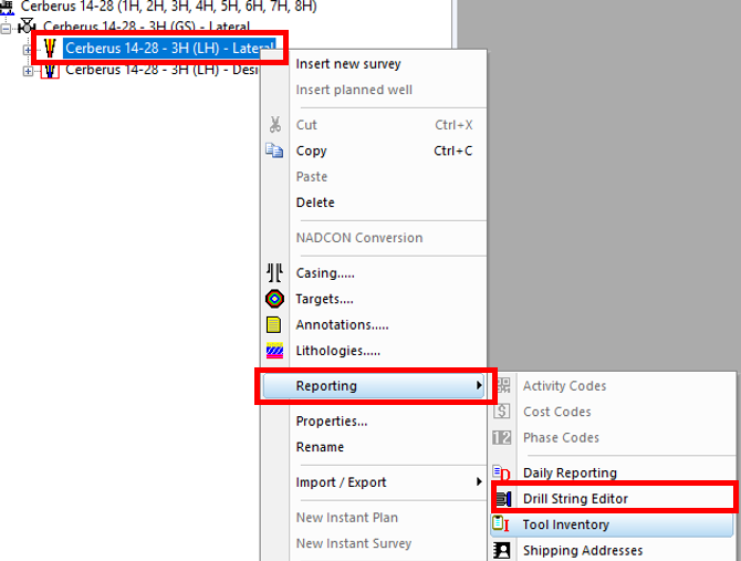 16\. Right click on the actual well and select **Reporting >> Drill String Editor**.