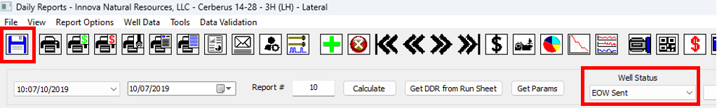 21\. Set the well status to **EOW Ready** or **EOW Sent**. Click on **Save** and then close the Daily Reports window.