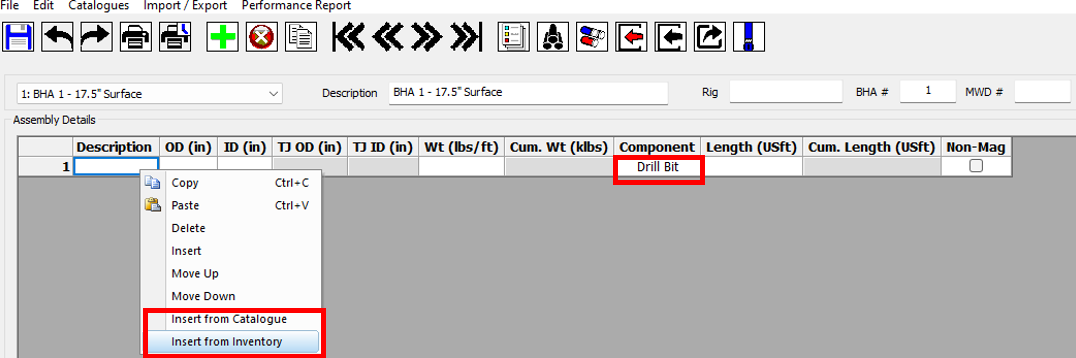 9\. Once you have finished QC’ing the Daily Report, you should make sure that all of your BHA performance reports are filled in. Right click on the actual well and select **Reporting >> Drill String Editor**, then open the **Performance Report** by clicking on the icon in the toolbar.