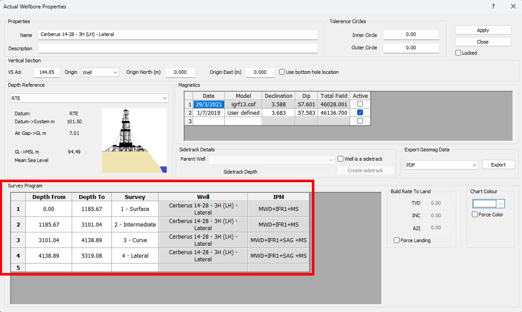 10\. In the Actual Wellbore Properties window that appears, input and check the actual well **name, vertical section, magnetics** and **depth reference details**. If your well is a sidetrack, refer to [**this page**](https://docs.innova-drilling.com/introduction/well-seeker-pro-guides/untitled-2) for a guide to tying your well onto its mother bore. After checking your inputs, click on **Apply** and then **Close**.