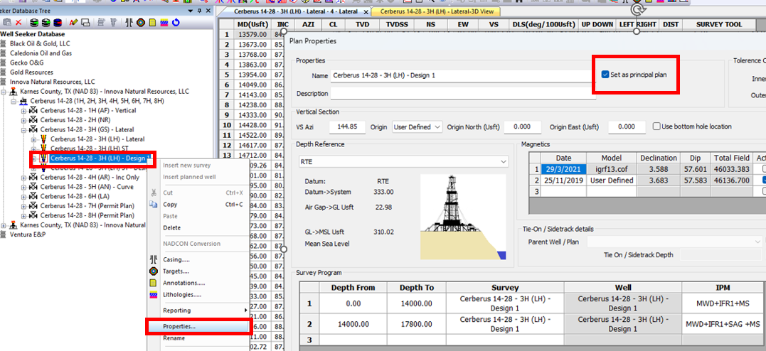 7\. Make sure that your principal well plan has been correctly designated. Right click on the well plan and select **Properties.**