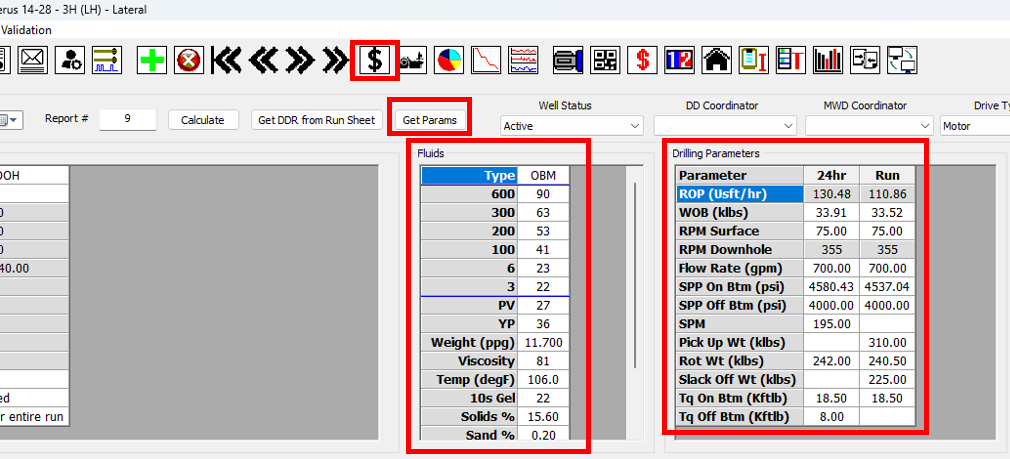 8\. Open the **Data Validation** menu and select **Get drilling params from slide sheet all reports**. This will take the drilling parameters that you have just checked in your slide sheets, and use them to update the 24hr and run parameters in in your Daily Report.