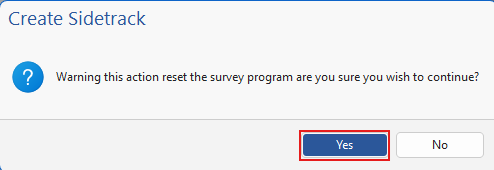 As soon as create sidetrack has been selected, the below warning will appear. This is warning that proceeding will reset the survey program in the plan or actual wellbore properties. This is not an issue as this section will currently be blank anyway. Select **Yes.**