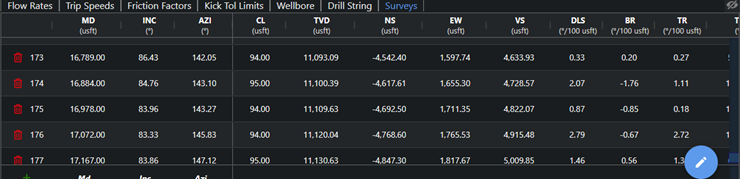 **Note:** Any changes made in this table will also affect the surveys saved in the Surveys page for the well.