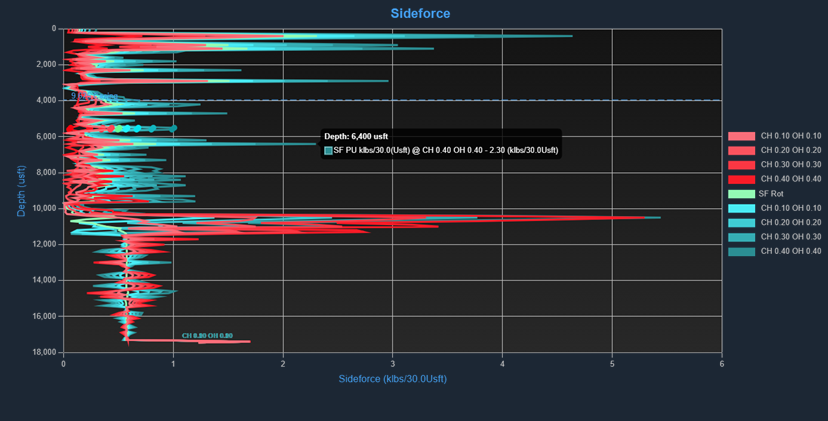 The chart displays the rotating side force along with the pickup and slack off side forces for each set of friction factors entered in the Friction Factors table.