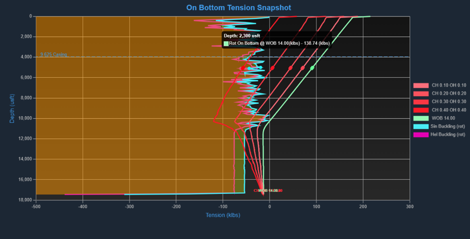**Sinusoidal Buckling**: If the Rotating or Sliding lines cross this threshold, the string will experience sinusoidal buckling at that point. The further the line drops below the threshold, the more severe the buckling during the activity in question.