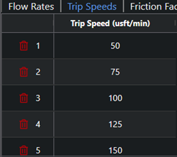 Enter the pump flow rates that will be used for the hydraulics modelling. The torque and drag modelling also requires one flow rate to be entered. If multiple flow rates are entered, the torque and drag calculation will use the first value in the list.