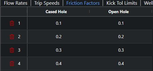 **Casing Wear Factor:** Defined as the ratio of friction factor to specific energy (units E-10psi-1), the casing wear factor is used to quantify the effects of pipe/casing material and drilling fluid on casing wear. The table below should be used as guide for casing wear factor selection.