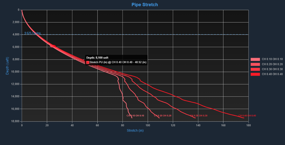 This chart displays the amount of pipe elongation the user would see when picking up, for each of the friction factors entered in the Friction Factors table. The Y-Axis denotes the bit position.