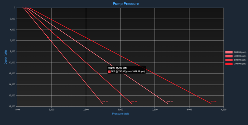This chart displays the standpipe pressure (SPP) expected at surface when the bit is at the depth specified on the Y-Axis. There will be a line displayed for each of the flowrates entered in the Flow Rates input table.