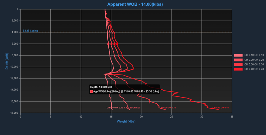 This chart displays the apparent weight on bit (WOB) required at any given depth to achieve the actual WOB entered in the Drilling Parameters section.