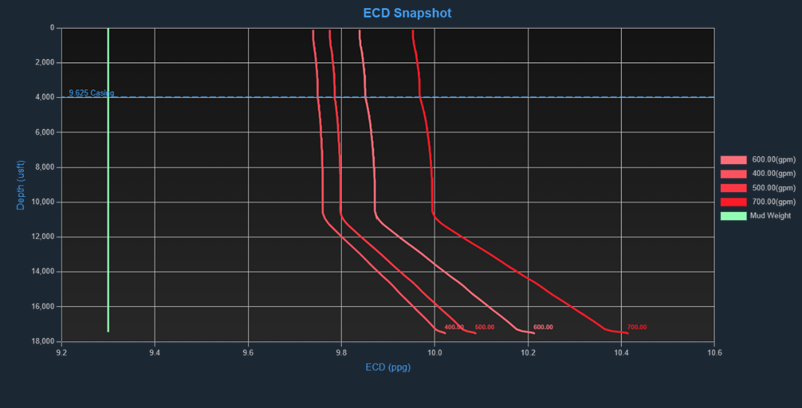The ECD snapshot line shows the expected ECD at each point in the annulus when the bit is at the **Calculation Depth** specified in the Case Details section. This line is generated based on a cuttings free annulus, which means that the last point for both the Clean ECD line and the ECD Snapshot line will be the same.