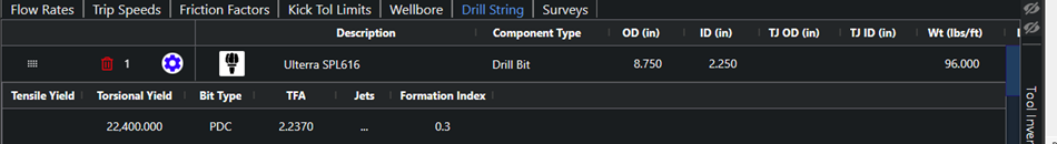 **BHA:** Select the drill string that will be used for this case. Strings created in the Drill String page for the well will be available here. The components for the selected drill string will populate the Drill String table in the Input Tables section. A new blank string can be created by clicking on the \<img src="<https://100379801-files.gitbook.io/~/files/v0/b/gitbook-x-prod.appspot.com/o/spaces%2F-McEwHTOM_v4MexTVGSe%2Fuploads%2FuNl2JyruieRq4cfkfhi6%2F6.png?alt=media>" alt="A green cross in a grey square