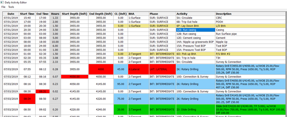 The Daily Activity Editor can be used to check for mistakes in the daily activities. Cells will be highlighted in red if the end time/depth do not match with the start time/depth of row below. Cells in the BHA and Phase columns will also be highlighted in red if the BHA/phase is different to the ones above and below. This is usually an indicator that the user has filled in the wrong BHA/phase by mistake.