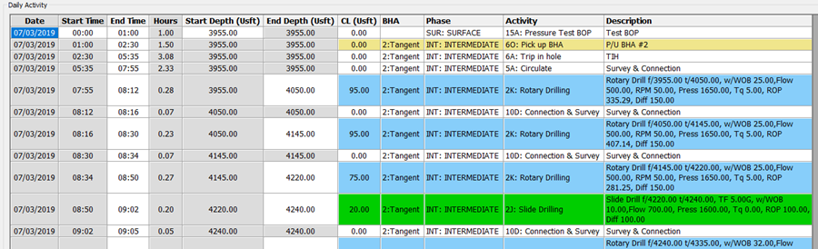 Activity: The activity code description that the rig site operations fall under. This information is used in the calculation of ROP, Slide Drill Run, Rotary Drill Run, Slide Hours Run, Rotary Hours Run and Circulating Hours Run, when Get Slide Rotate Hours from Activity is selected. Activity is also used in the creation of the KPI tracking graphs. For more information on Activity Codes see Section 13.1 - Activity Codes.