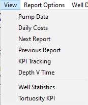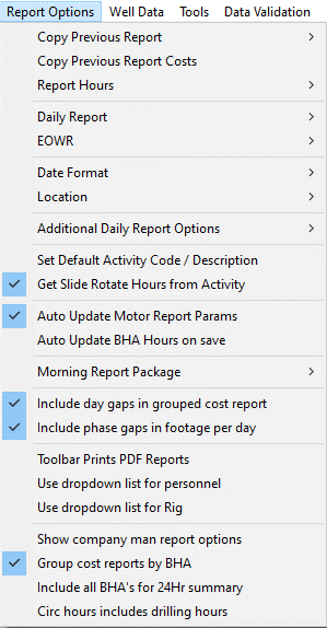 Create Morning Report Package: Creates a zipped folder which contains a copy of the current database and an excel morning report. The morning report contains the following tabs: Summary, Well Summary, Personnel Report, Field Invoice, Grouped Invoice, Tool Inventory, Tool Utilization, Depth vs Time, Activity Summary chart, Phase Summary chart, Footage per Day chart, Footage per Phase chart, Survey Report, all Daily Reports, all BHA’s, all BHA Performance Reports, all Daily Cost Reports.