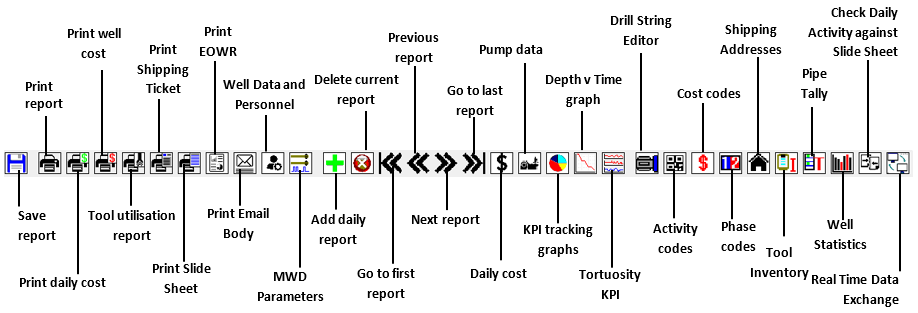 The user can access all features of the daily reporting module via either the menus, the toolbar or the main user interface itself. The figure below details the functions of the DDR toolbar. All the options available via the toolbar are also available from the various menus at the top of the page.