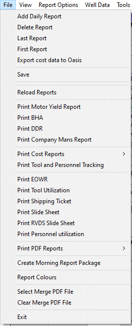 Additional Daily Report Options: This submenu only applies to Excel format DDRs. It allows the user to add other reports from the Reporting module to the DDR when it is printed using the Print DDR button in the File Menu.