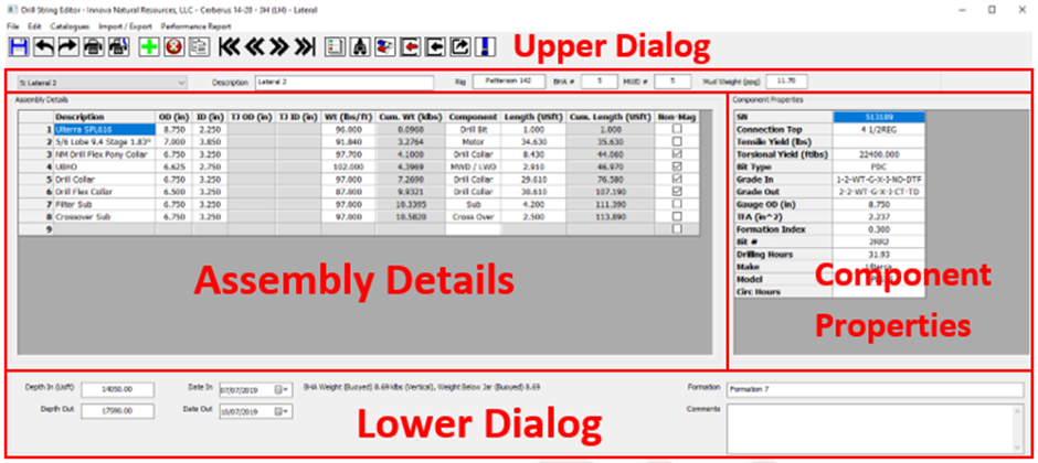 The Drill String Editor window is divided into five parts: The toolbar, the top dialog, the lower dialog, Assembly Details and Component Properties.