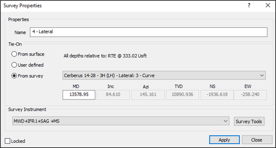 * **From survey / plan**: This option is only available if the plan is a side track, select the survey file of plan to tie on to and type the MD which you wish to use. The INC AZI NS EW and TVD will be interpolated from the survey or plan selected.