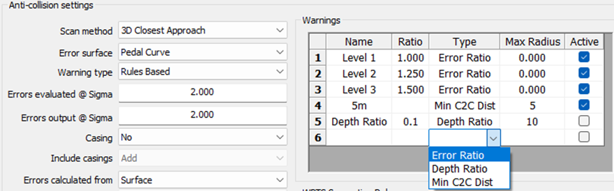 **Warnings Grid:** This allows the user to define the warning rules which will be displayed on anti-collision reports. If “Error Ratio” is selected as the warning type, the grid will display “Name” and “Ratio” Columns. The name will be displayed on an anti-collision report if the separation factor is less than or equal to the value in the “Ratio” column. If “Rules Based” is selected as the warning type, the grid will have the additional columns “Type”, “Max Radius” and “Active”. The type column specifies if the value entered in the “Ratio” column is a clearance factor or a depth ratio. The “Max Radius” Column only applies to depth ratios and specifies the maximum radius to be added to the total error radius. The “Active” column specifies if the rule will be evaluated or not.