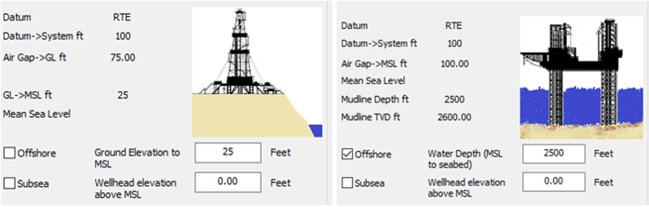 If “offshore” is selected, the user can enter the well head elevation above MSL. If “subsea” is selected, the elevation below MSL can be entered. This is the distance between the top of the well head and MSL.