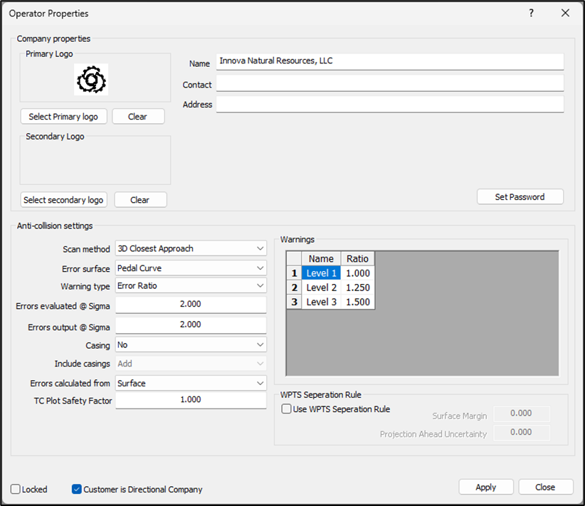 **WPTS Separation Rule:** Toggling on the **Use WPTS Separation Rule** option on instructs the software to use the WPTS Separation Rule to calculate the separation factor value when running anti-collision. It also allows the user to set the value for the two additional parameters used in the calculation – the surface margin and project ahead uncertainty.