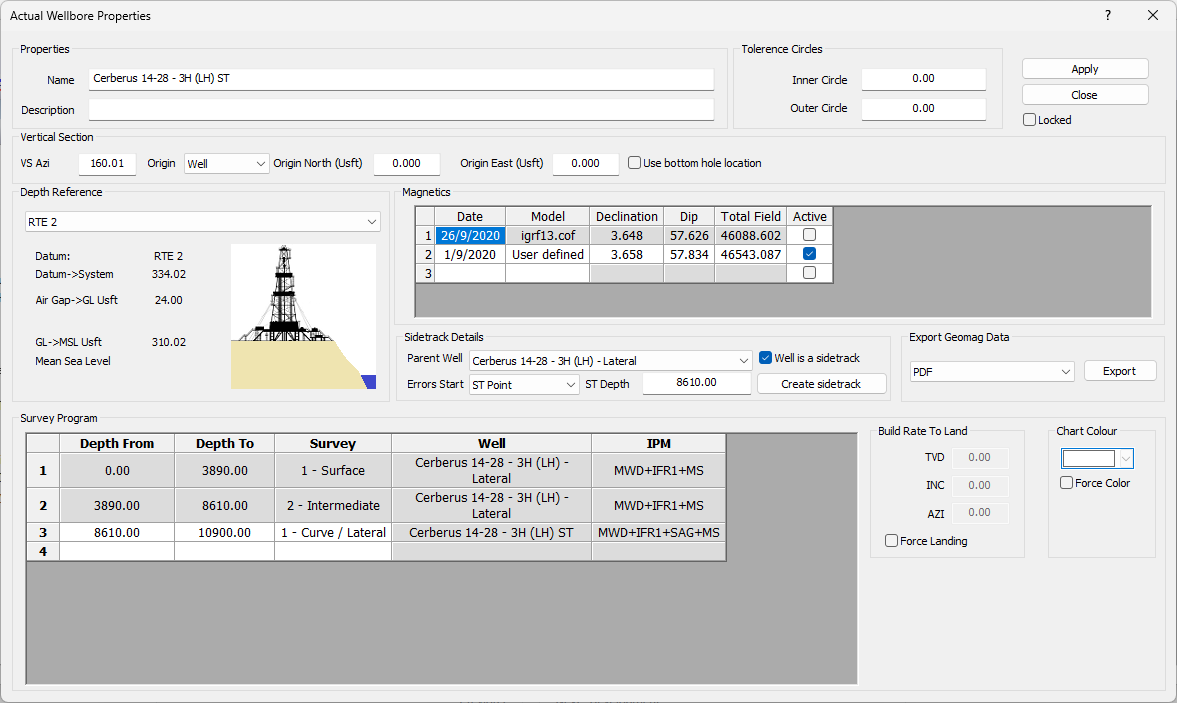 **Survey Program**: The survey program specifies how the planned wellbore is constructed and which ipm’s will be used to create the planned wellbore. Select the plan or survey from the drop-down box and enter the depths to use. If the line entered is part of the current plan, the IPM can be selected from the drop-down menu. If the plan is a sidetrack, then the survey program will populate from surface to the sidetrack depth with the relevant motherbore details and the ipm for these lines will not be editable.