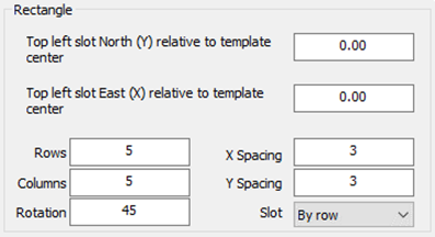 The offset from the template centre is defined by the first two edit boxes and this represents the offset from the centre point defined in the template centre section. The number of rows and columns are defined in the “Rows” and “Columns” edit box and the clockwise rotation of the template is defined in the rotation section. The X and Y spacing is defined by the X and Y spacing boxes and the slot numbering can be specified from the drop-down menu.