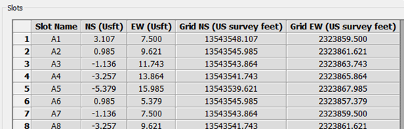 If single slots are selected from the geometry section, then the slot locations and names are entered in the grid at the bottom of the dialog.