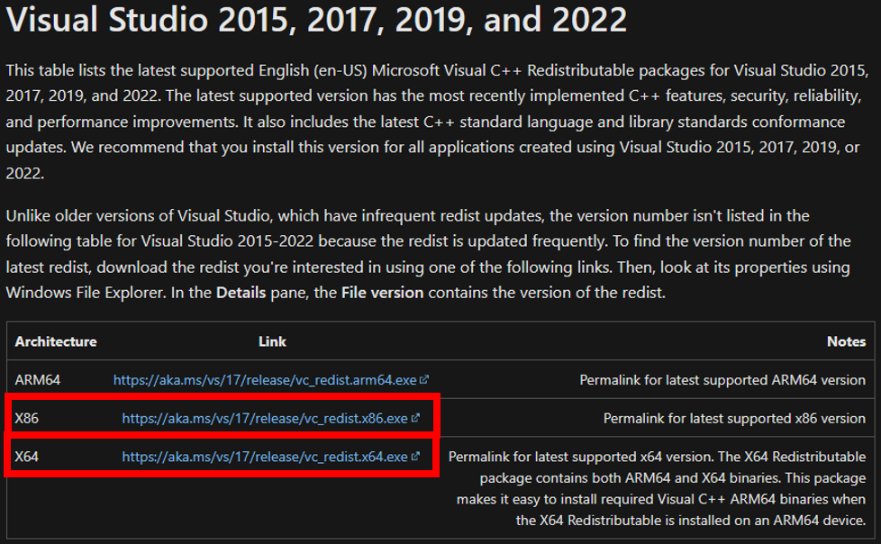 1. Follow this link: [Latest supported Visual C++ Redistributable downloads | Microsoft Learn](https://learn.microsoft.com/en-US/cpp/windows/latest-supported-vc-redist?view=msvc-170)