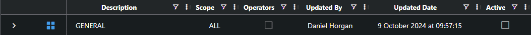 **Scope:** Double click to open a drop down menu. Available options are ALL or OPERATOR. If you are using the **Operator Access** dialog to restrict the schema to specific operators, you must select OPERATOR. Otherwise select ALL.
