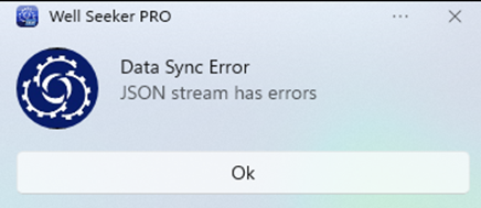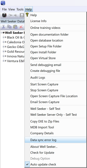 Well Seeker stores a log of all data sync events that have occurred on a specific PC. To access this select **Help > Data sync error log** and the log file will open.