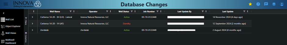 The Database Changes page allows an organization's administrator to track the most recent change to each well in their server database.