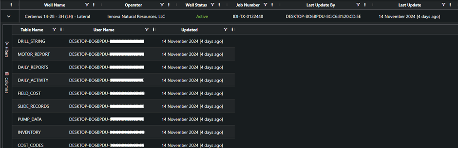 Click on the <img src="https://100379801-files.gitbook.io/~/files/v0/b/gitbook-x-prod.appspot.com/o/spaces%2F-McEwHTOM_v4MexTVGSe%2Fuploads%2FQFw7JdMF6beMyF3n6loX%2Fimage.png?alt=media&#x26;token=a7e3f7cd-556c-44fd-8183-3ea0bfe46acd" alt="" data-size="line"> beside a well to expand the line. The expanded view breaks the well down into it’s constituent data tables. For each data table, the **Updated** column displays the last time the data table was updated. The **User Name** column displays the user or computer who made the update.