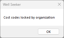 **Locking Dialogs:** Any or all of the following dialogs can be locked: Cost Codes, Activity Codes, Phase Codes, Shipping Addresses, MWD Probe Catalog, Rig Names, Personnel Names & Details, and the Real Time Data Exchange. When a dialog is locked, the local Well Seeker user will not be able to access or edit it. Instead, they will get the below message. Any changes to these dialogs would need to be done on the server database, either via the Web portal or Well Seeker, by someone with the relevant permissions.